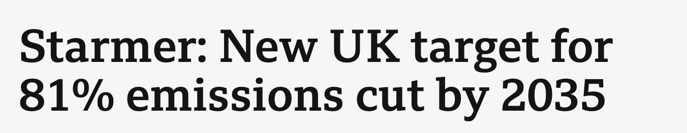 - 英国首相基尔·斯塔默在全球峰会上宣布了新的气候变化目标——英国现在的目标是到2035年减排81%。