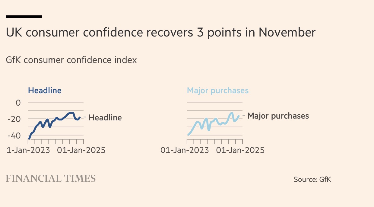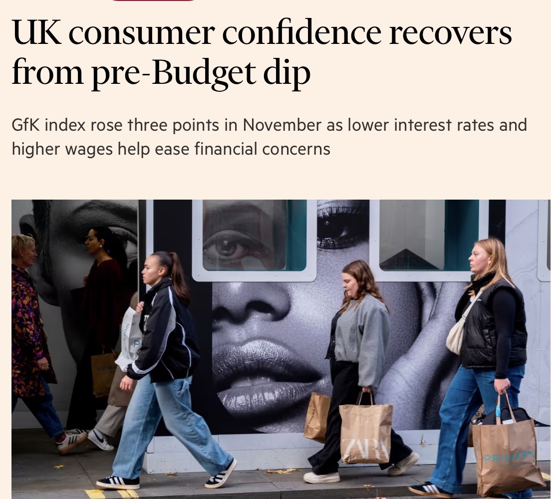 - 据金融时报报道,最新数据显示:英国消费者信心在预算公布前下滑后正在反弹,经济学家将这种转变归因于利率下降、工资上涨以及对增税的担忧减少。