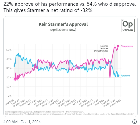 自该党在7月4日大选中获胜以来,斯塔默的民调支持率就一路暴跌。