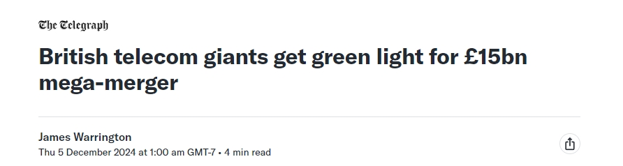 英国竞争和市场管理局 (CMA) 批准了这项合并交易,这将打造英国最大的移动网络运营商,预计拥有2,700万客户。