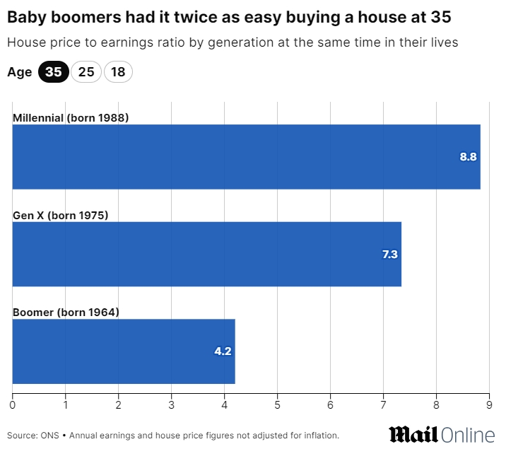 根据ONS的数据,1999年(当时婴儿潮一代中最年轻的成员为35岁)的房价中值为70,000英镑。他们这个年龄段的平均收入为16,700英镑。这相当于房价与收入比率为4.2。