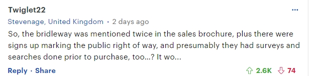 对于这对夫妻的遭遇,有网友表示难以理解,并说:“所以,在销售手册中两次提到了马道,而且还有标志标明了公共通行权,想必他们在购买之前也进行了调查和搜索……?这…”