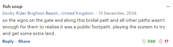 还有网友认为:“大门上的标志,骑马专用道和其他小径上的标志不足以让他们意识到这是一条公共道路。他们在利用系统,试图得到一些额外的土地。”