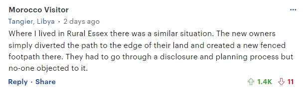还有网友表示,完全可以用更为理智的办法。“在我住的乡村,也有类似的情况。新主人只是把旧路改道到他们土地的边缘,在那里建一条新的围栏人行道。他们必须经历一个披露和规划过程,但几乎没有人会反对。”
