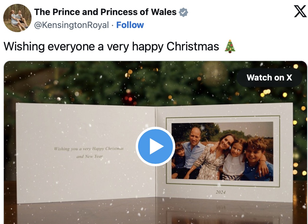 官方发布的一段简短视频中,贺卡摆放在圣诞树前的桌子上,背景是飘落的雪花,营造了温馨的节日气氛。