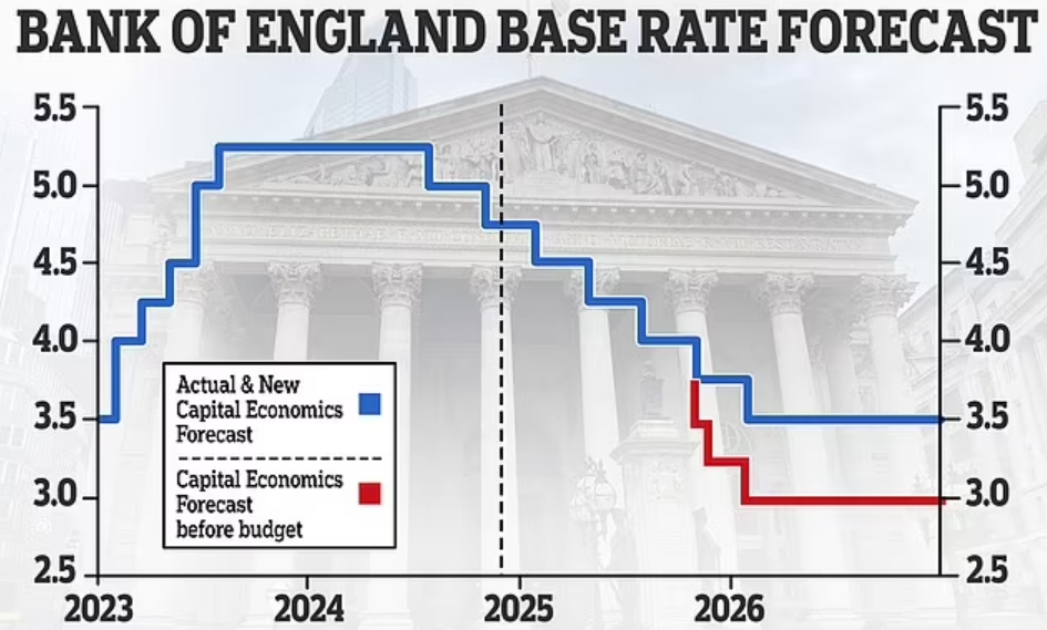 凯投宏观曾预测到明年年底基准利率将降至3%,但在最新预测中,他们表示,由于工党第一个预算的影响,以及通胀率的小幅回升,利率现在下降的速度将会放缓。