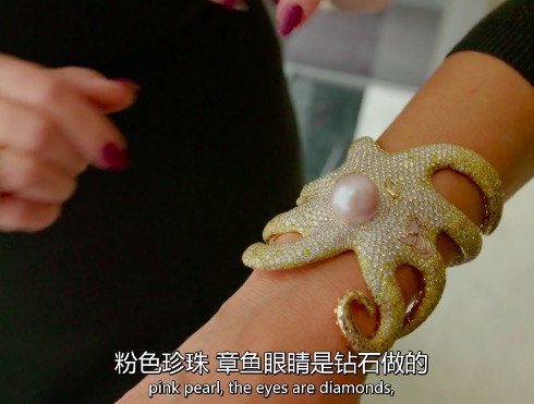 章鱼手镯的眼睛是钻石制作,还采用了大颗的粉色珍珠