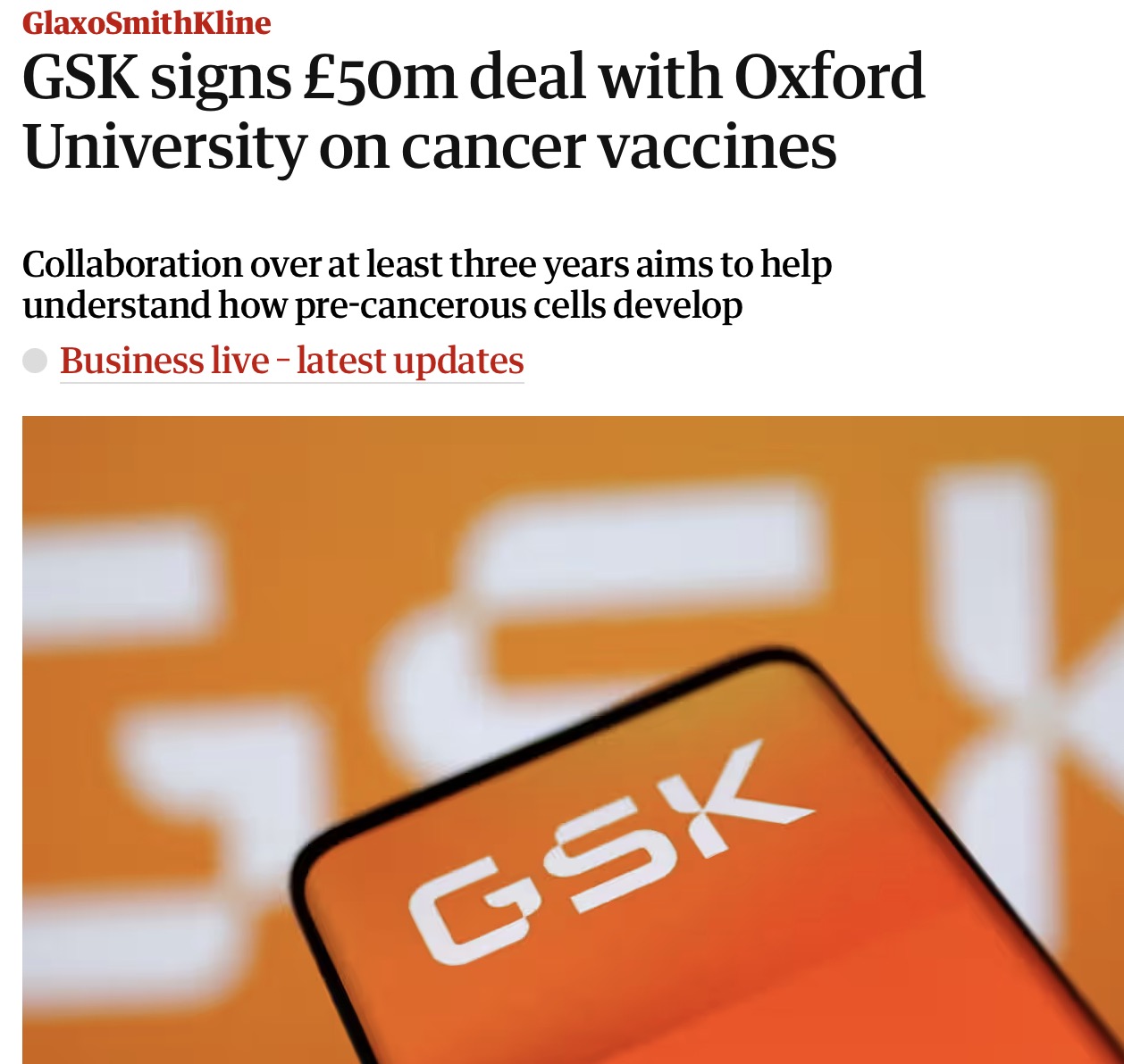 - 葛兰素史克与牛津大学签署5,000万英镑的癌症疫苗协议。