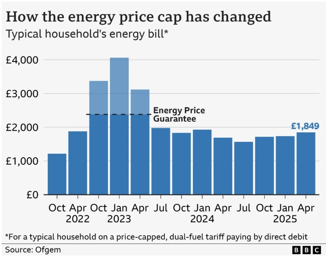 该上限每三个月调整一次,限制了供应商对每单位能源收取的费用,影响到英格兰、威尔士和苏格兰的2,200万户家庭。