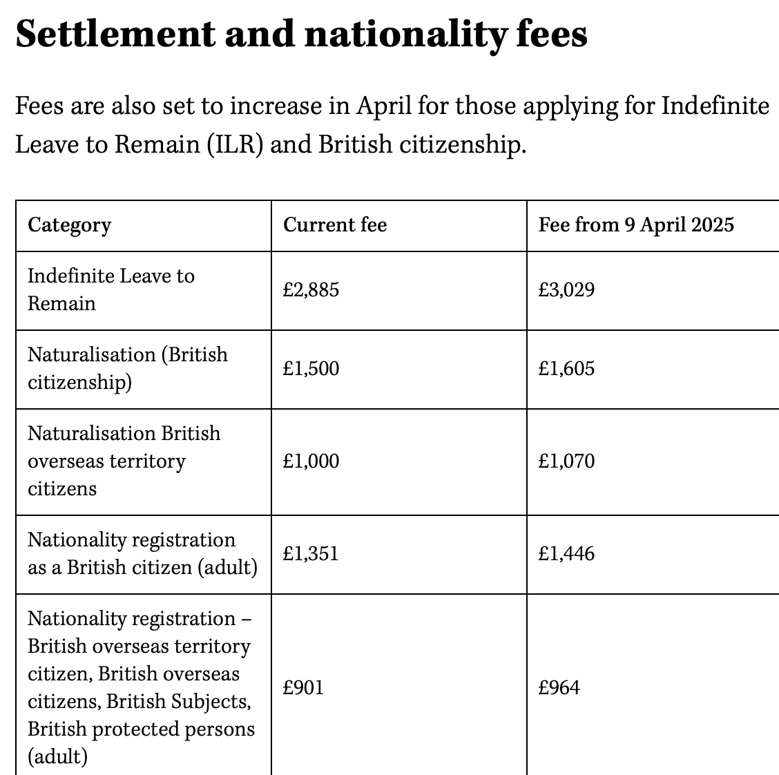 英国内政部于近日正式公布移民及入籍费用调整方案,确认自2025年4月9日起实施新一轮费用上涨。