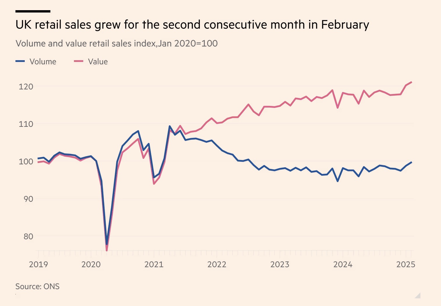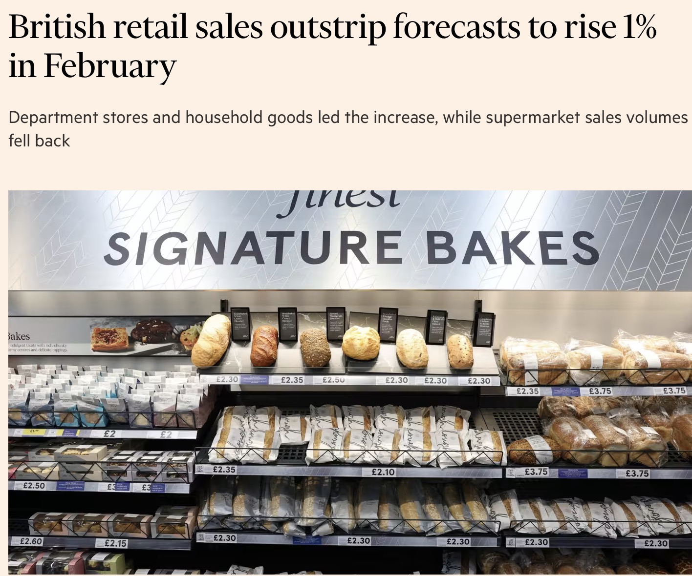 - 英国零售销售额在2月份增长了1%,主要得益于服装和家居用品商店的销售增长,尽管消费者信心低迷、经济增长乏力,但这一增长仍超出预期。