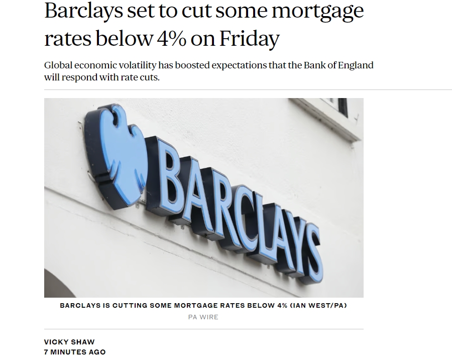 就在今天,巴克莱银行(Barclays)也宣布将部分抵押贷款的利率下调至4%以下。