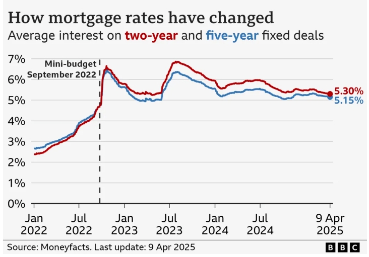另外,据Moneyfacts的最新数据,截至4月9日,两年期固定抵押贷款的平均利率已小幅下降至5.3%,五年期固定抵押贷款的平均利率也小幅下降至5.15%。