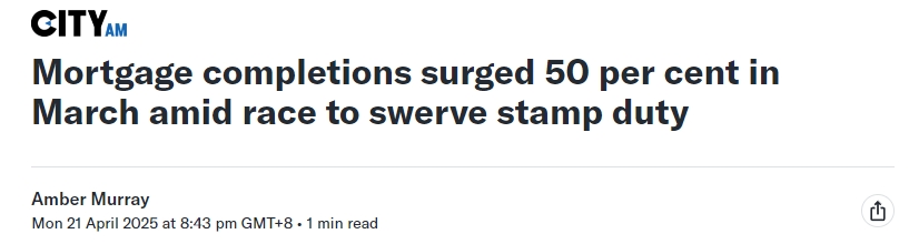 - 由于买家急于在印花税政策变更前完成交易,英国3月份的抵押贷款完成量环比激增50%…