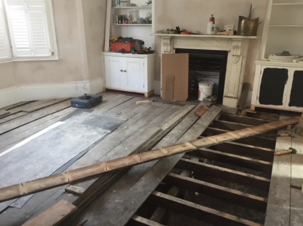 最先是楼层的拆除与保温层铺设,同时对一楼做了基础改造,比如在客厅安装了壁炉,拆除老旧墙纸、重新粉刷。