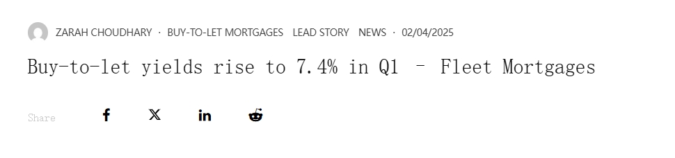 受益于租金持续稳定的上涨,英国房东的回报率也屡攀新高。Fleet Mortgages的最新研究发现,2025年第一季度,英格兰和威尔士的购房出租平均收益率上升至7.4%,同比增长0.3%。
