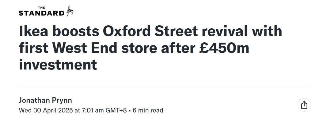 据报道,在投资近5亿英镑后,全球最大的家具零售商宜家在伦敦牛津街的最新门店将开业,这一举措也被视为牛津街复兴的一个新里程碑。