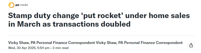 - 由于买家争相赶在印花税政策变更前购房,3月份英国房屋销量与去年同期相比增长了一倍多…