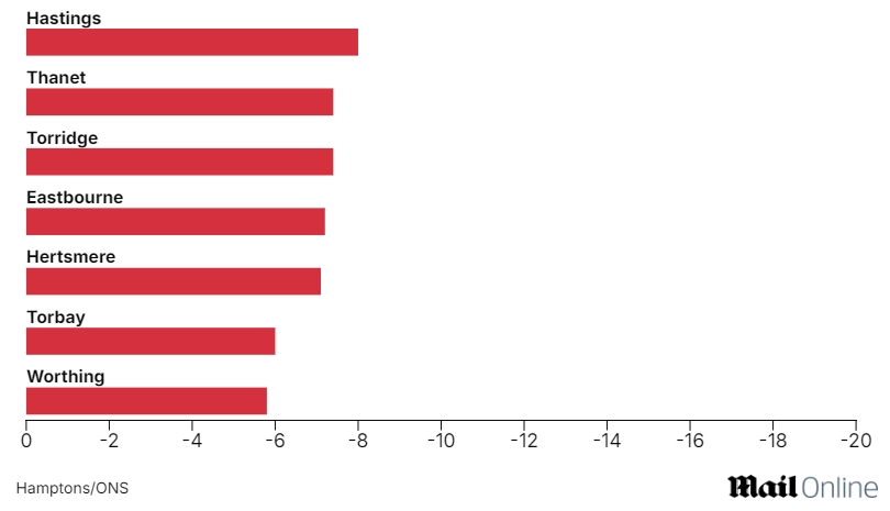其中跌幅最大的海滨城市是英格兰南海岸东萨塞克斯郡(East Sussex)的Hastings。当地房价在2019年下半年至2022年下半年期间上涨了近三分之一,达到278,060英镑的峰值。 但2022年至2024年间Hastings的房价持续下跌8%。
