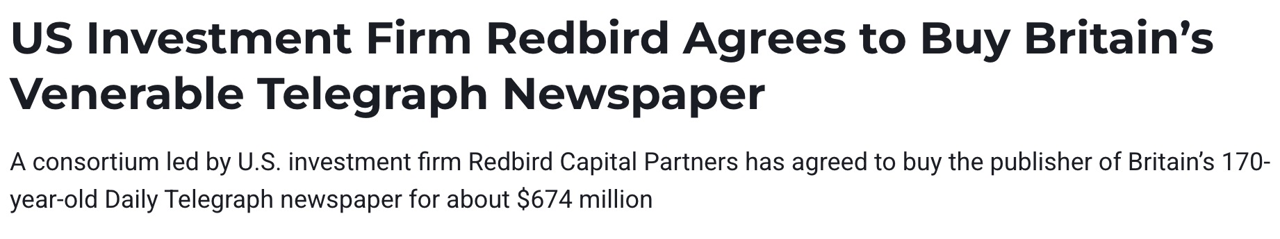 5月23日,来自美国的私募股权公司RedBird Capital Partners宣布,其牵头的财团已成功收购英国知名右翼报纸《每日电讯报》(The Daily Telegraph)及其周末姊妹刊《星期日电讯报》(The Sunday Telegraph)的母公司Telegraph Media Group,交易总额约为5亿英镑。