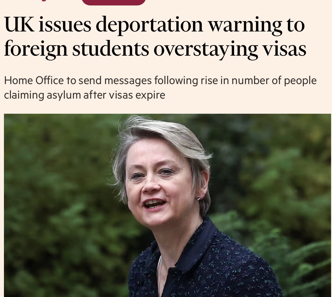 未来几个月,约13万名国际学生及其家属将收到这类信息,明确告知他们,如果在英国“没有合法居留权”,将不得继续停留。