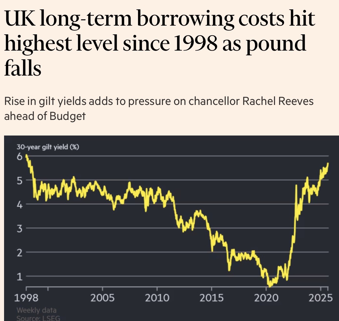 在财政大臣雷切尔·里夫斯为秋季预算做准备之际,30年期英国国债收益率一度上涨0.06个百分点至5.70%,随后小幅回落至5.68%。债券收益率上升意味着债券价格下跌,也显示投资者要求更高的回报来购买英国国债。