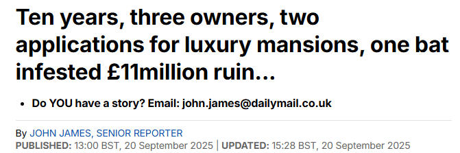 但问题关键在于——信息的透明度。布拉顿庄园的挂牌信息确实以小字注明图片“仅为规划效果示意”,却同时在多处内容上模糊真实与虚构的边界。譬如,其宣传中所称的地块范围远大于实际可开发面积。同时,中介Tim Phillips虽声称“项目已启动”,却完全未提及该工程自2015年起就已停滞荒废、现有建筑属于废弃状态等重要事实。