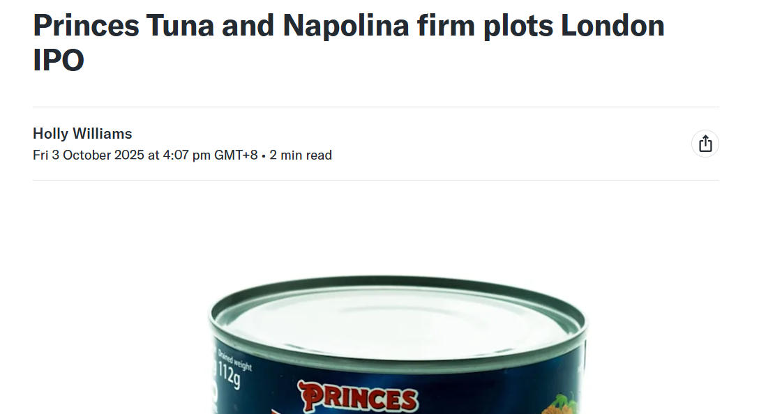 Napolina品牌所有者Princes集团宣布将在伦敦进行IPO,此举预计使其估值达到15亿英镑,为伦敦市场带来最新提振。