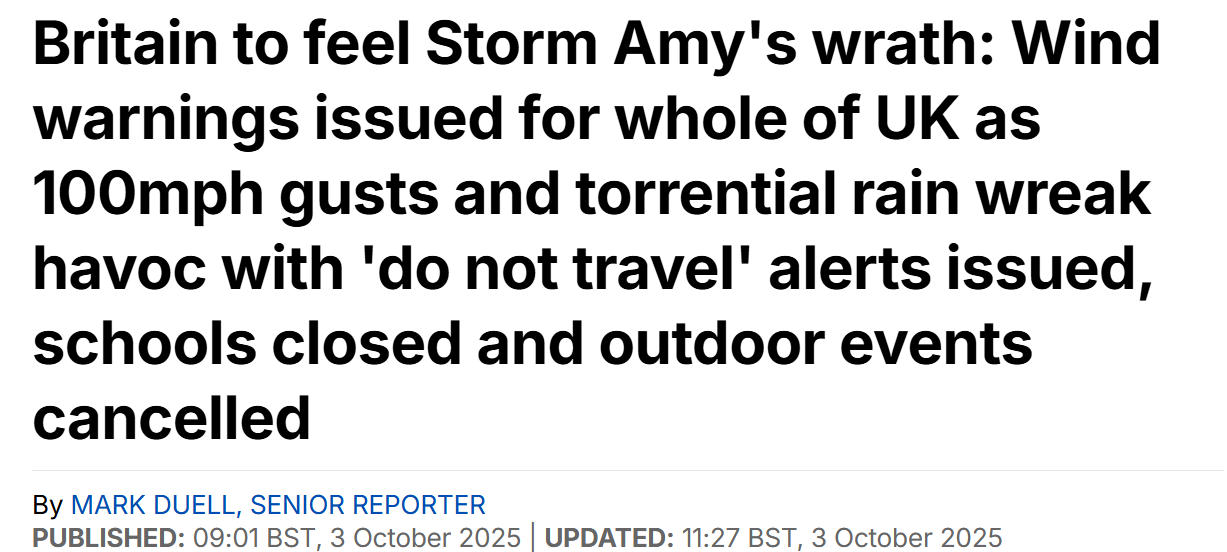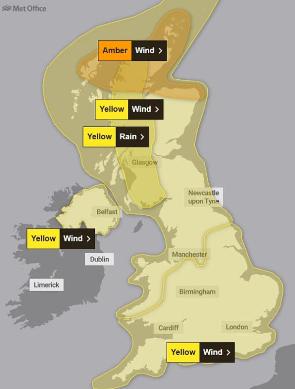 随着风暴Amy登陆英国,英国全境发布预警。此次风暴将给多地带来暴雨,并产生时速高达100英里的狂风。
