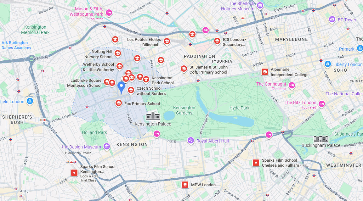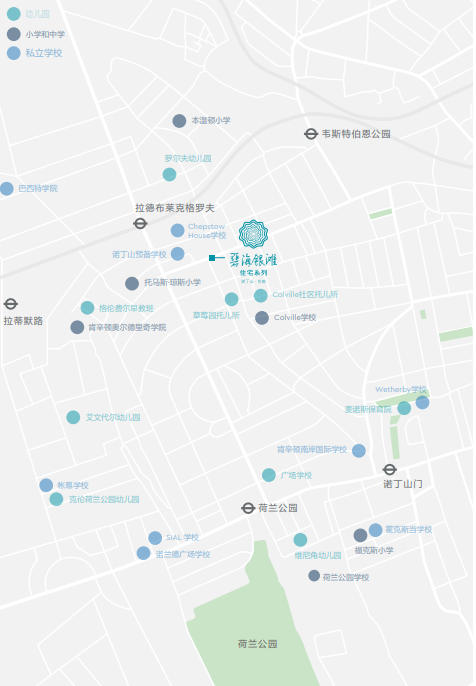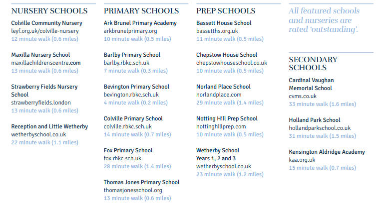 项目附近有40多所托儿所、中小学以及顶级私立学校,包括众多备受推崇的学校,如Wetherby School、Chepstow House School等。
