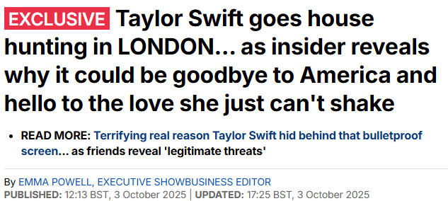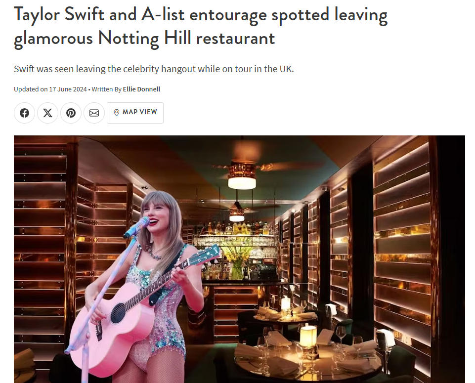 霉霉与伦敦的缘分实在匪浅,她不仅在多首作品中吟唱过伦敦风情,此前与演员乔·阿尔文相恋时也曾居住于附近的樱草山,对诺丁山一带颇为熟悉与喜爱。去年夏天,她更在诺丁山顶级会所Casa Cruz举办私人晚宴,也屡屡现身Annabel’s、Bob Bob Ricard与Chiltern Firehouse等场所举办明星派对,足见她对这片街区的偏爱。
