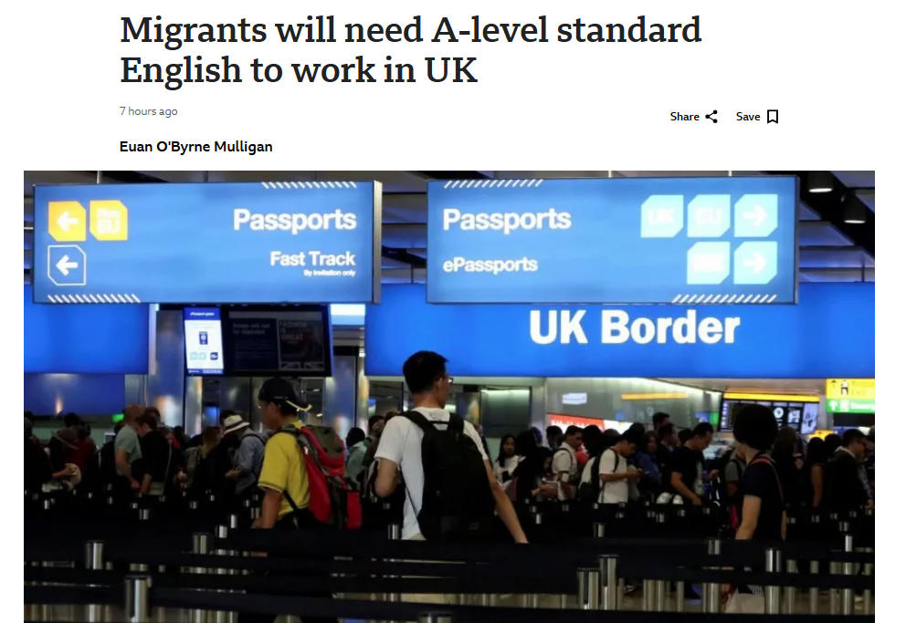 根据英国政府即将实施的更严格新规,自2026年1月8日起,一些赴英移民的英语能力需达到A级水平。