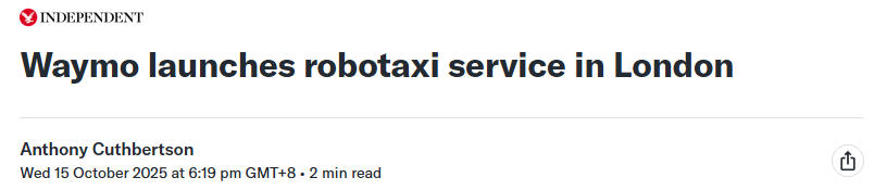 - 谷歌旗下自动驾驶公司Waymo宣布将其机器人出租车服务扩展至伦敦…
