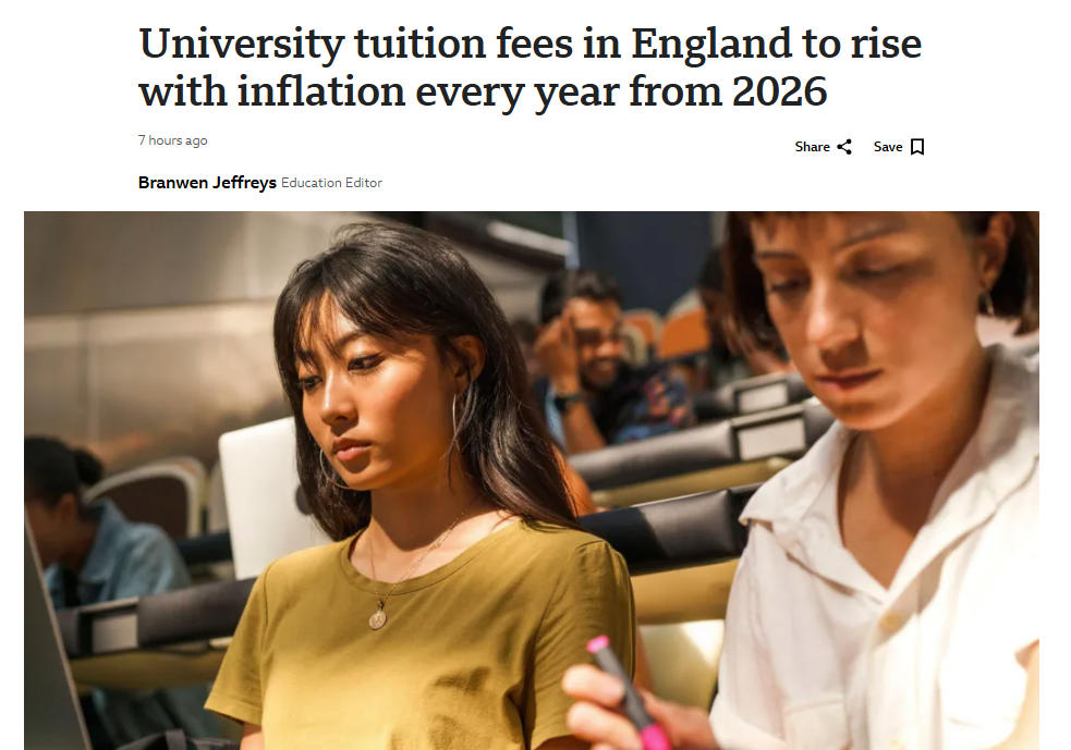 - 英国政府宣布,从2026年起,英格兰大学学费将根据通胀率逐年上调…