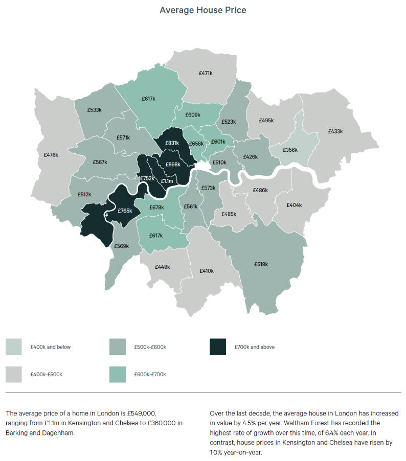 据报告,伦敦目前平均房价为549,000英镑,但各行政区间的价格差异很大,从肯辛顿和切尔西(Kensington and Chelsea)的平均110万英镑到巴金和达格纳姆(Barking and Dagenham)的平均360,000英镑。