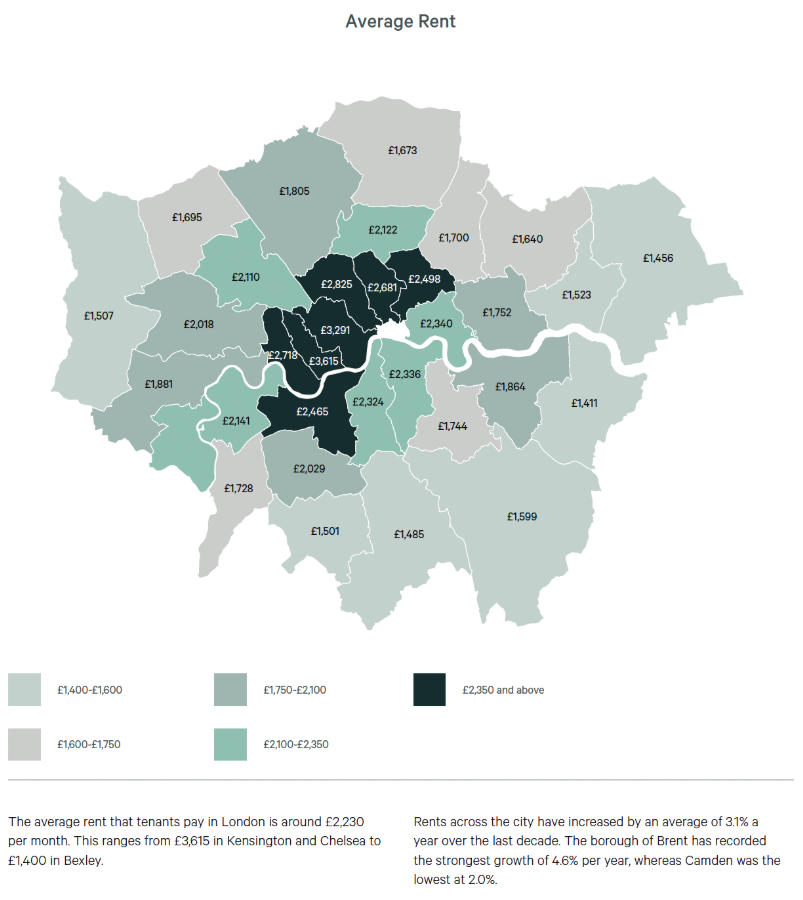 目前,伦敦的平均月租金为2,230英镑,其中,月租金最高的同样是肯辛顿和切尔西,平均为3,615英镑,最低的为贝克斯利(Bexley),平均为1,400英镑。