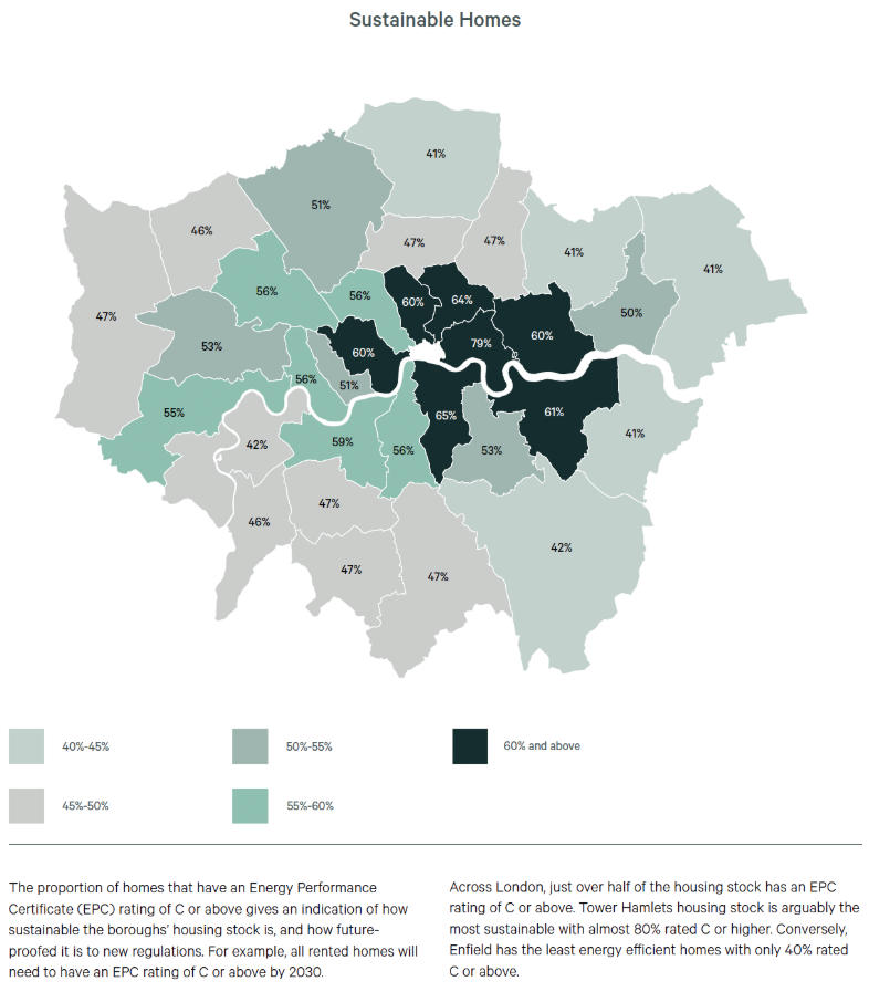 CBRE还深入研究了首都哪些地区拥有最节能的住房,结果显示,陶尔哈姆莱茨(Tower Hamlets)位居榜首,该区近80%的房屋的EPC评级为C级或以上。紧随其后的是南华克(Southwark)和格林威治(Greenwich),这一比例分别为67%和61%。
