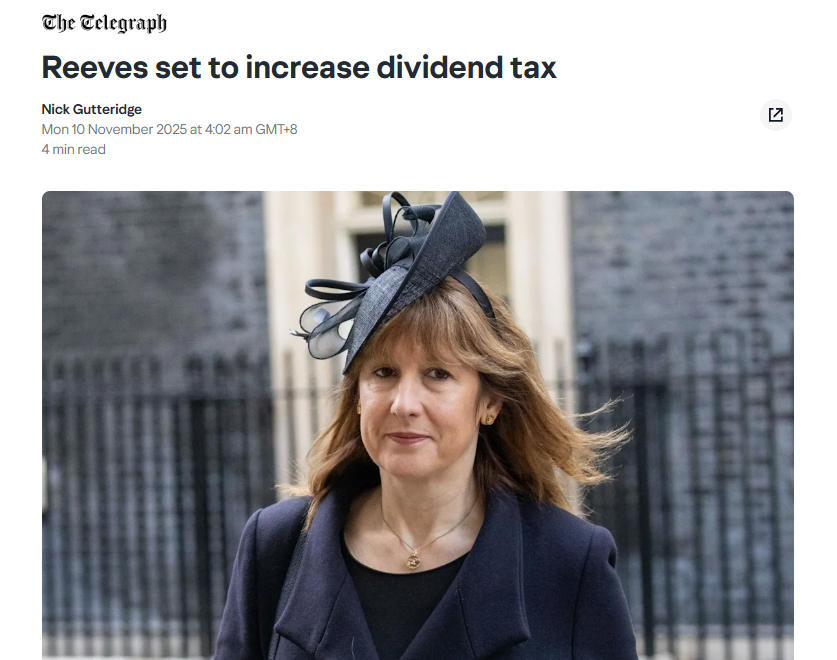 - 英国财政大臣雷切尔·里夫斯拟在11月26日发布的预算案中提高股息税…