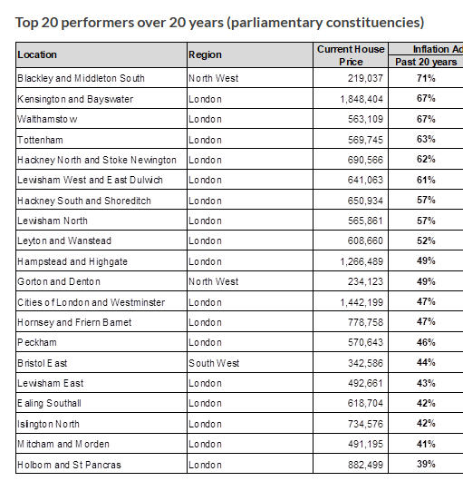 过去20年,伦敦的房价增长一直占据主导地位,经通胀调整后房价增长最强劲的20个议会选区中,有17个位于伦敦。