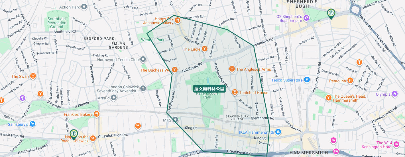 拉文斯科特公园位于伦敦哈默史密斯-富勒姆区(Hammersmith and Fulham),整个区域以占地21英亩的美丽的拉文斯科特公园为核心,也由此而得名。