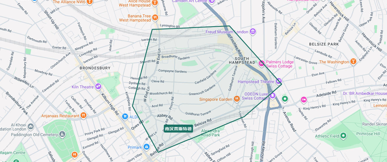 在交通方面,该地区有South Hampstead、Swiss Cottage、Finchley Road等多个地铁站,为居民提供了四通八达的出行选择。