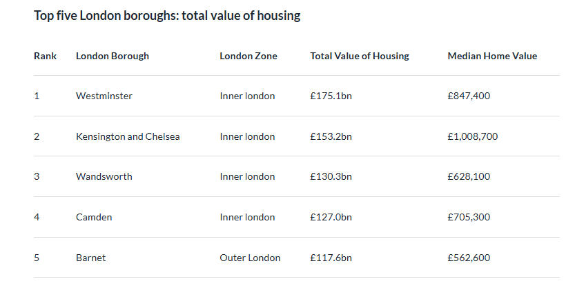 价值前五的行政区——威斯敏斯特、肯辛顿和切尔西(Kensington and Chelsea)、旺兹沃思(Wandsworth)、卡姆登(Camden)和巴尼特(Barnet)——房产总价值超过7,000亿英镑,占首都住房总值的21%。
