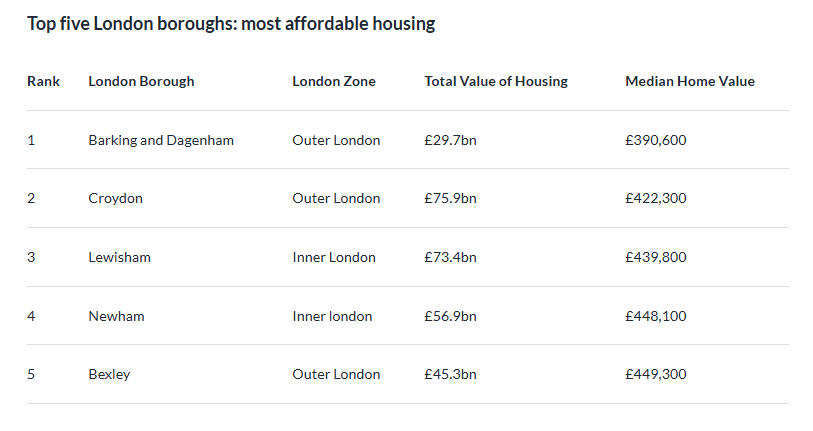 五个最可负担的行政区——巴金及达格纳姆(Barking & Dagenham)、克罗伊登(Croydon)、刘易舍姆(Lewisham)、纽汉(Newham)和贝克斯利(Bexley)——房产总值占比为11%,住房存量占比则达16%。