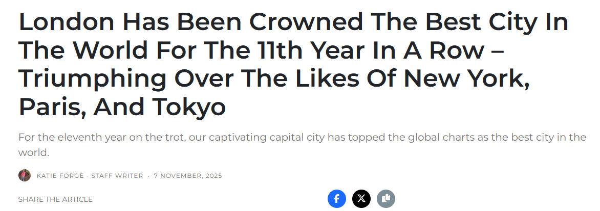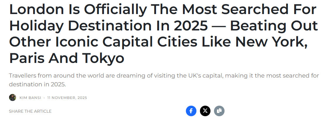 - 伦敦已连续第11年被评为全球最佳城市,同时,荣获2025年搜索量最高的度假目的地…