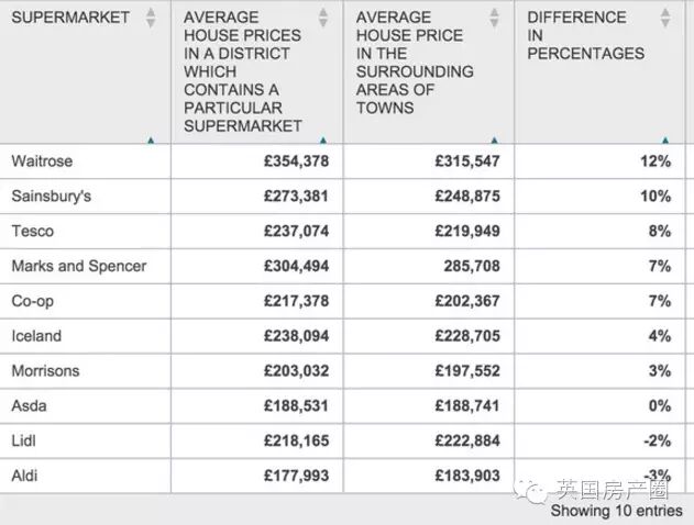 总体看一下Lloyds Bank今年年初通过提取分析英国土地登记局(Land Registry)的房价数据,将超市周围的房价和该区域不靠近超市的房价进行了比较,得出了这个很有意思的结论: