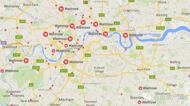 伦敦Waitrose超市分布图,可以看出东西伦敦的Waitrose超市在数量上的差距非常显著……