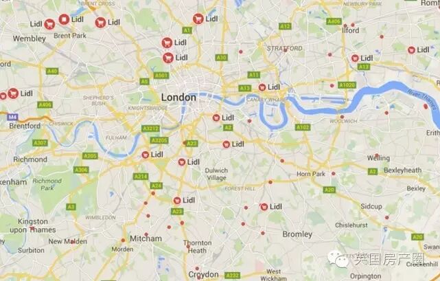 伦敦Lidl超市分布图,对比Waitrose的分布图,我们发现Lidl的分布比较散乱。但仔细观察就会发现伦敦西边和西南边的富勒姆(Fulham)、切尔西(Chelsea)、温布尔登(Wimbledon)等地区开有许多Waitrose,却没有一家Lidl……