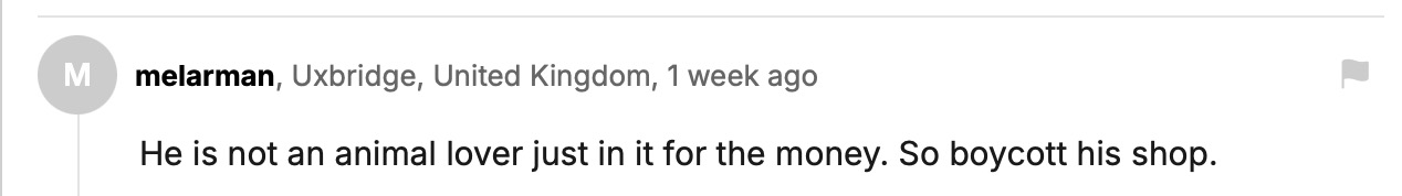 他根本不是什么爱动物的人,只是为了赚钱而已。所以大家抵制他的店吧。