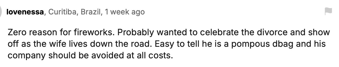 放烟花完全没有理由。八成是想庆祝离婚、顺便在住在不远处的前妻面前炫耀一下。一看就知道他是个自大又讨厌的人,这家公司最好敬而远之。