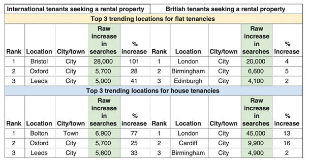 值得一提的是,城市几乎包揽了所有趋势榜单的前三名。在众多城市中,大曼彻斯特地区的博尔顿(Bolton)是唯一一个位居榜首的城镇。而牛津(Oxford)和利兹(Leeds)的国际租客需求显著上升。